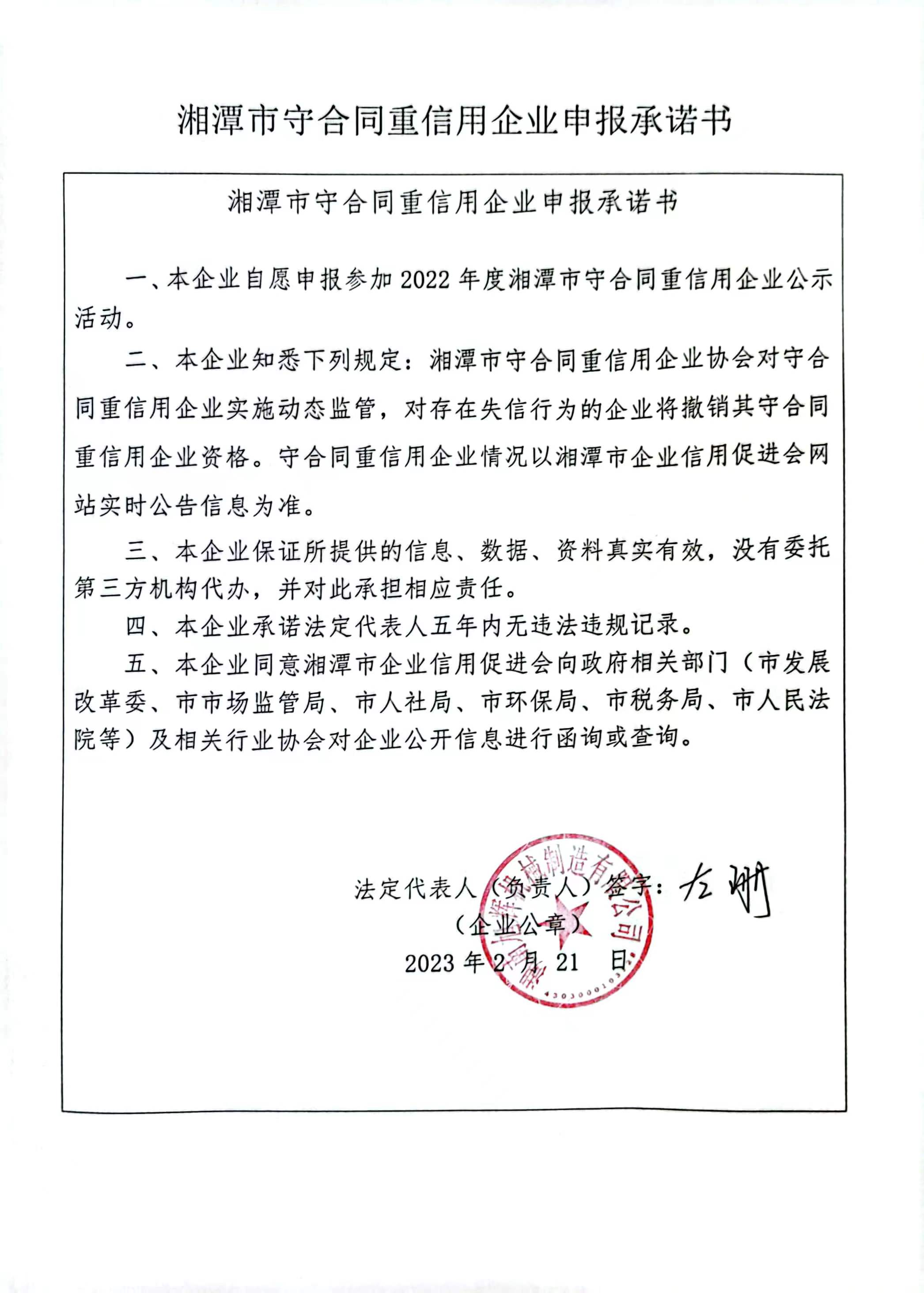 本企業(yè)根據《湘潭市守合同重信用企業(yè)申報規(guī)定》等編制 2022 年度企業(yè)信用報告書,并保證本報告書內容真實、準確、完整。