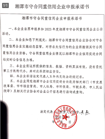 本企業(yè)根據(jù)《湘潭市守合同重信用企業(yè)申報(bào)規(guī)定》等編制 2023 年度企業(yè)信用報(bào)告書,并保證本報(bào)告書內(nèi)容真實(shí)、準(zhǔn)確、完整。