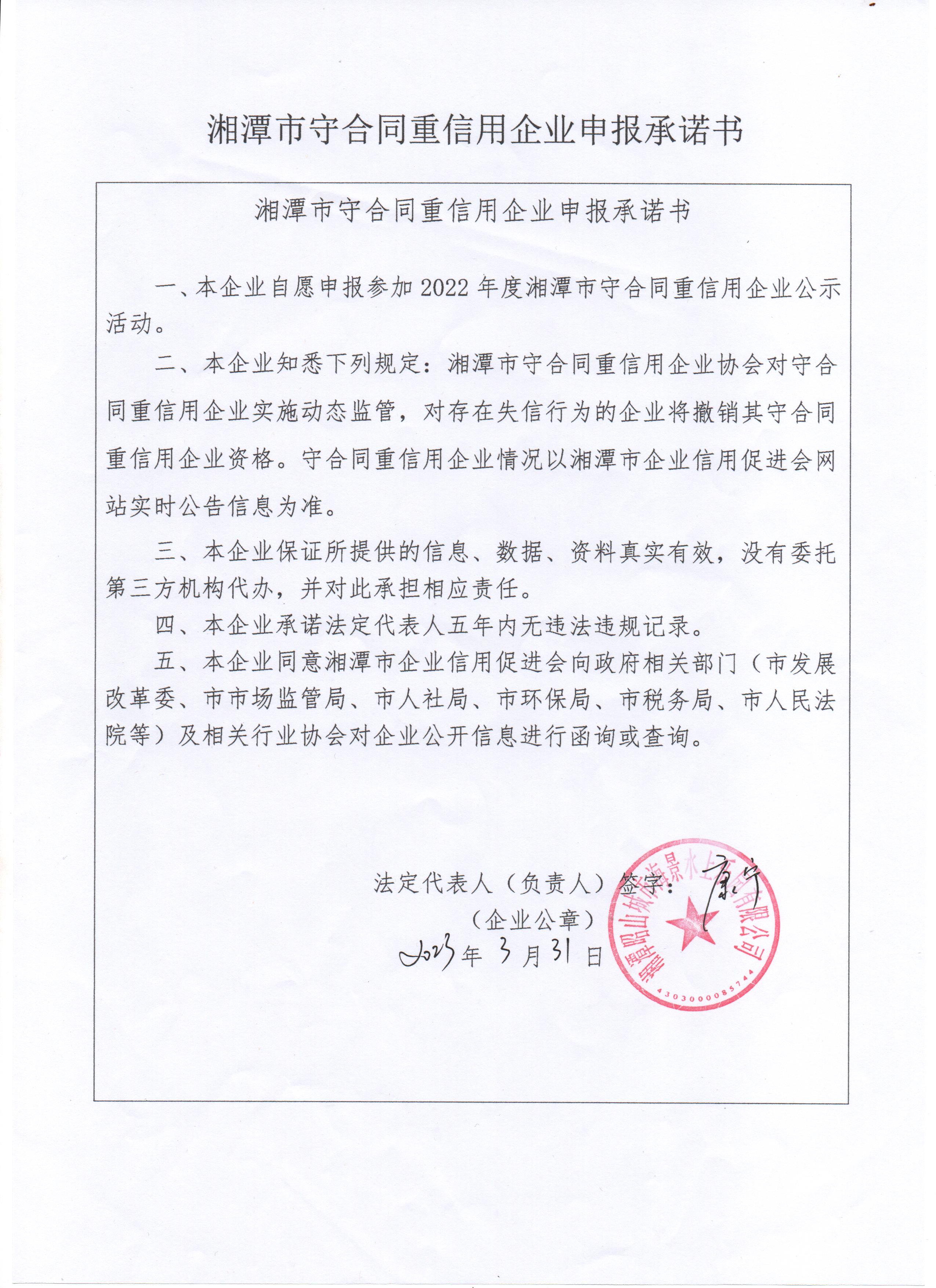本企業(yè)根據(jù)《湘潭市守合同重信用企業(yè)申報(bào)規(guī)定》等編制 2022 年度企業(yè)信用報(bào)告書,并保證本報(bào)告書內(nèi)容真實(shí)、準(zhǔn)確、完整。
